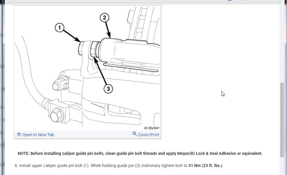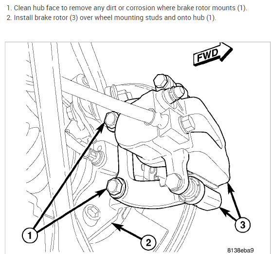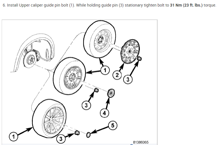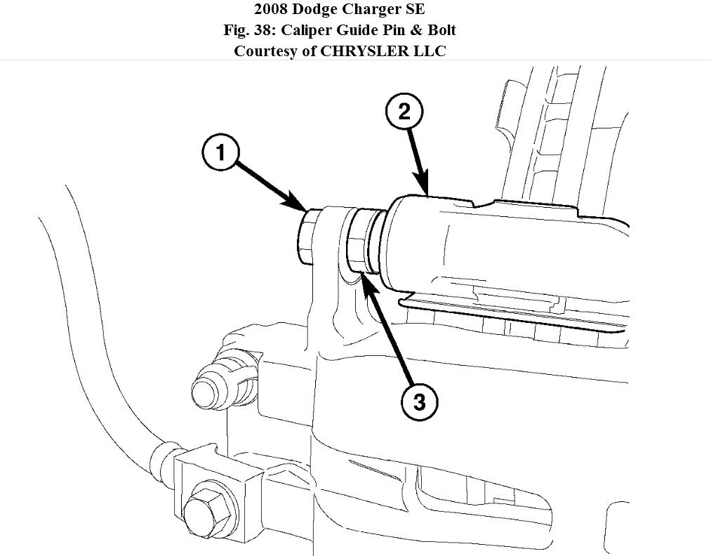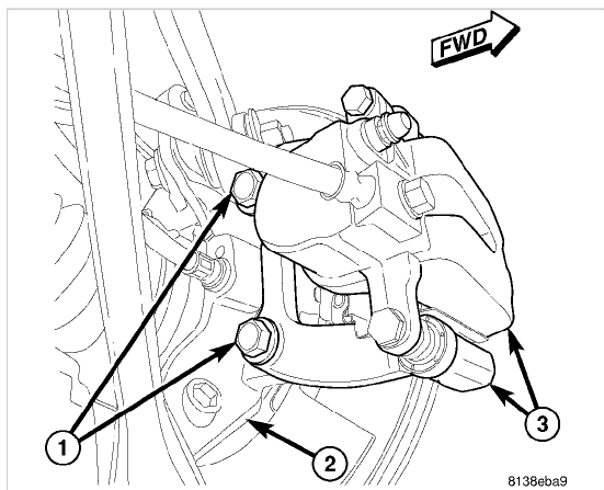 1. Remove Upper caliper guide pin bolt (1). To do so, hold the guide pin (3) stationary while turning bolt.