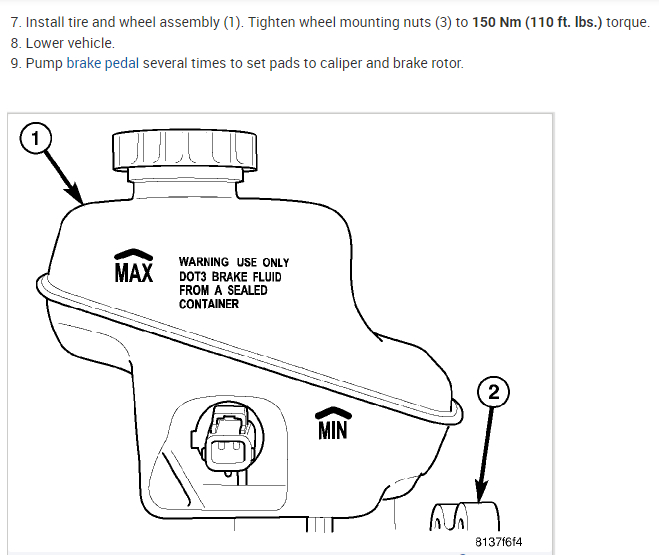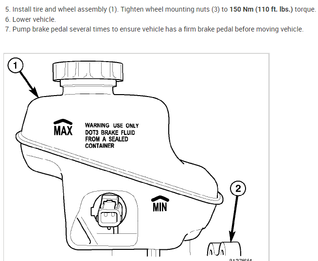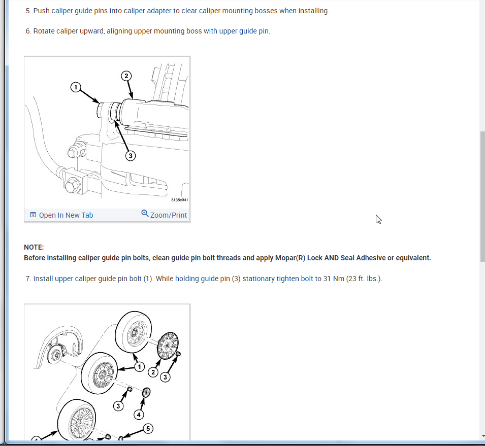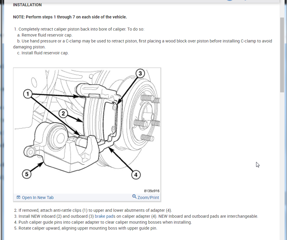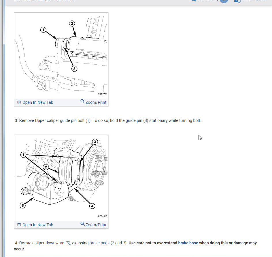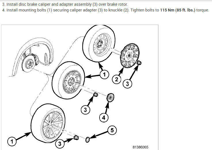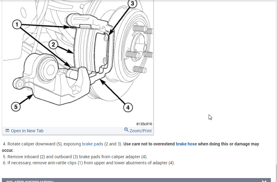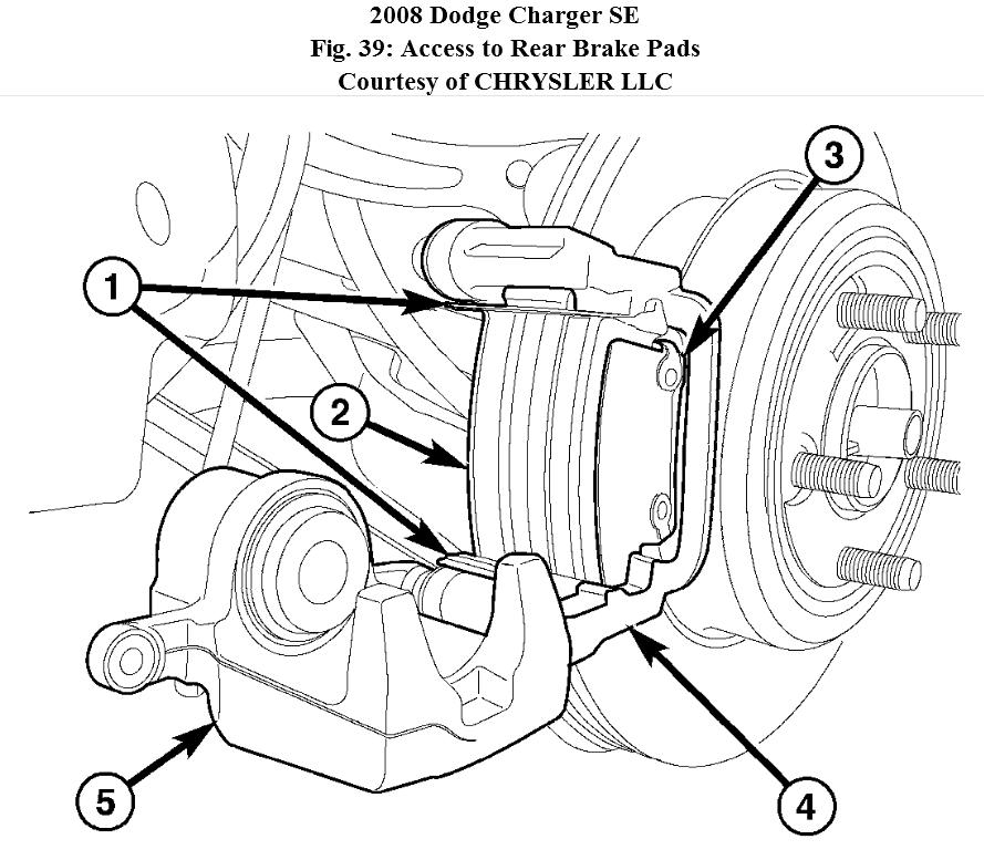 2. Rotate caliper downward (5), exposing brake pads (2 and 3).