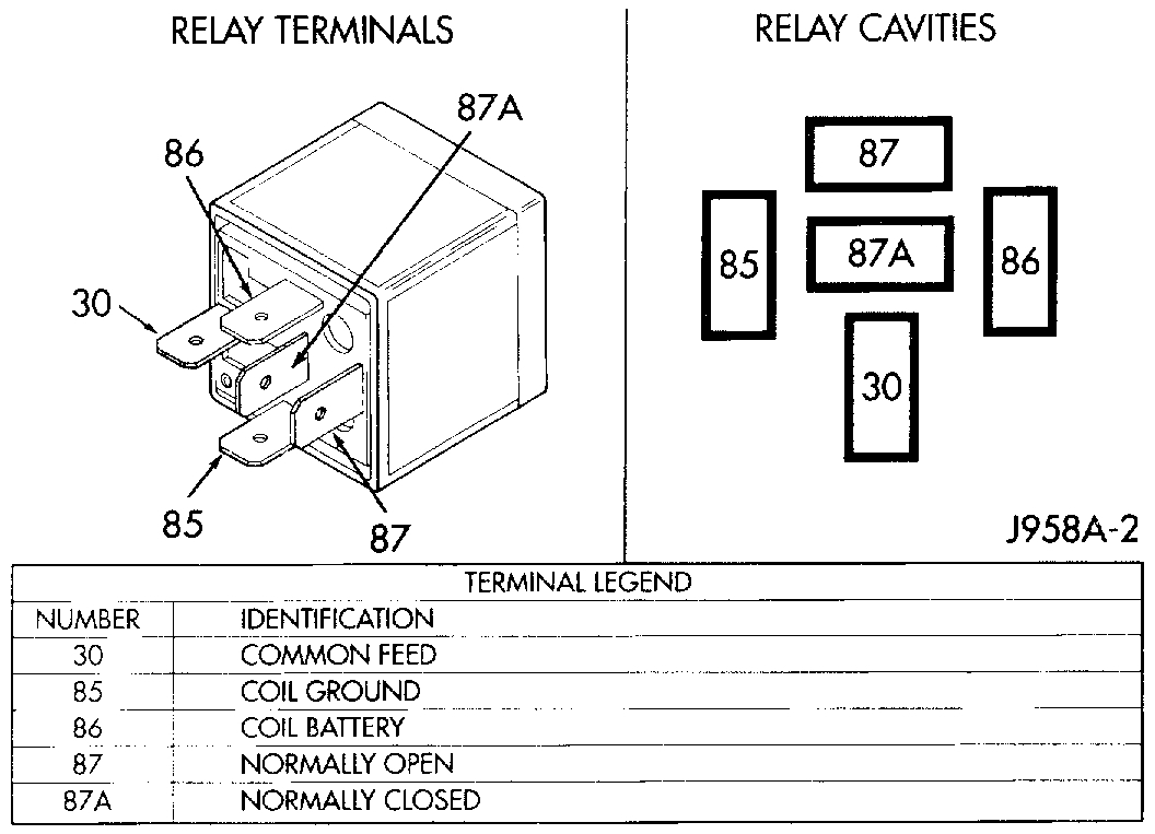 1. A relay in the de-energized position should have continuity between terminals 87A and 30, and no continuity between terminals 87 and 30. If OK, go to Step 2. If not OK, replace the faulty relay