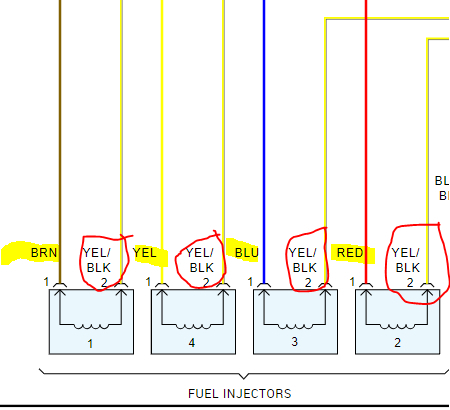I attached a pic below. Note that each fuel injector has a yellow wire with a black tracer. That is the power supply to the injector. Once you turn the key to the run position, each of those wires should have power. Using a test light, connect the alligator clip to the battery negative then probe the yellow/black wires to confirm the test lamp lights up, indicating power.