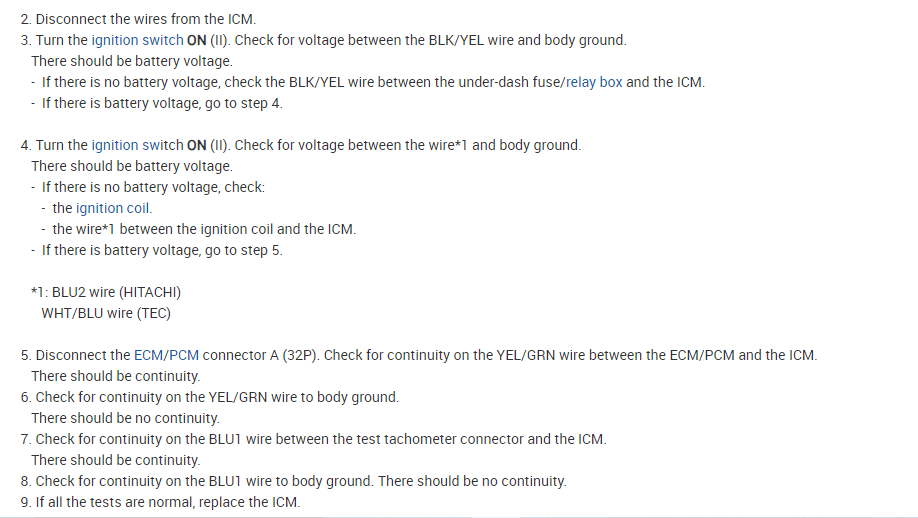 If they have power, we need to check if the ECM is providing a ground path to complete the circuit. The ground wires are brown, yellow, blue, and red. To check if there is a ground path, connect the alligator clip of a test light to the battery positive. And probe those wires one at a time while you have a helper crank the engine. When it is cranking, the test lamp should strobe on and off.