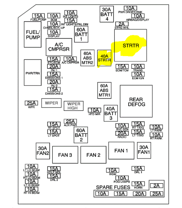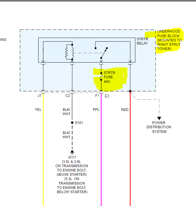 If you look at the pic I attached, it is for the 3.5L V6. I highlighted the starter fuse and relay. Now, if he jumped the red and purple wire in the relay connector, then the fuse is good. That leaves the relay or a signal issue from the ECM or a bad ground for the relay.