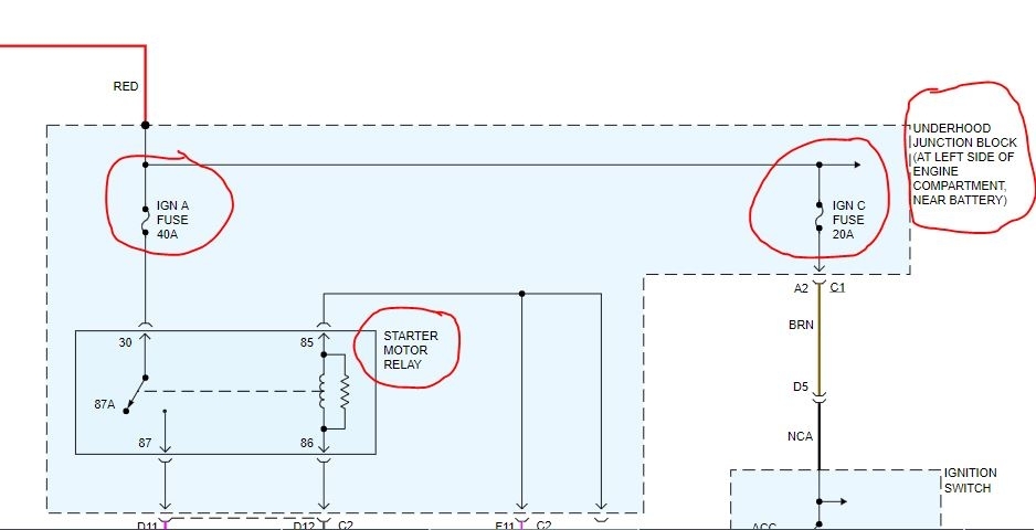 Third, pic 4 shows the ground for the starter relay. You need to confirm both the ground and the splice (both circled) are good and there is a ground path for the starter relay.