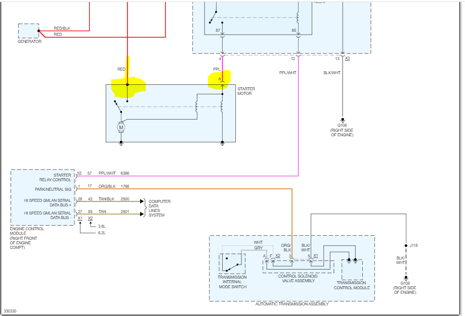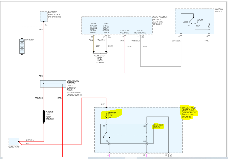 If the fuse is good and the relay, I need you to get a helper. If you look at pic 3, I highlighted two wires at the starter motor. One is red and a heavier gauge wire. This will have battery voltage at all times, so be careful not to short it.