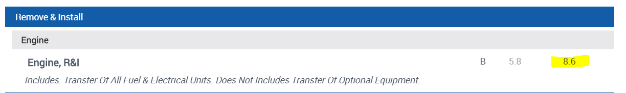If you look at the labor for removing and replacing the engine, it is 8.6 hours. See pic 2