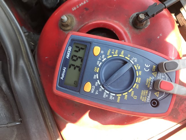 Finally. Move the positive meter lead to the positive terminal on the ignition coil. If you're seeing the same 9 volts you found originally, three volts is being dropped somewhere. Finding where is done this way by taking these voltage readings all along the circuit.