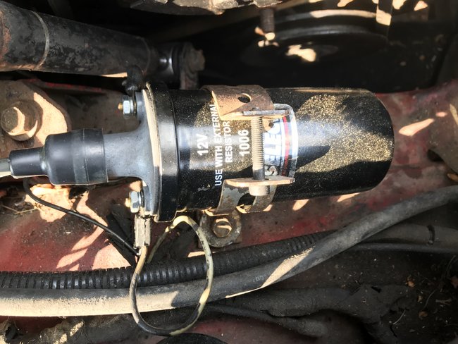 I'm still bothered by the low voltage to the ignition coil. Check if there is a condenser connected to it. In this application it would just be for radio noise suppression, but if it is "leaky", meaning not quite shorted, it could draw the voltage down.