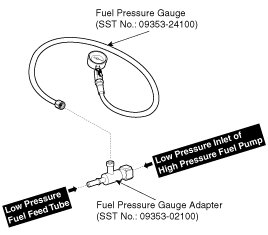 (2)Install the special service tool for measuring the fuel pressure in between the low fuel feed tube and the low pressure inlet of high pressure fuel pump (Refer to the figure below).
