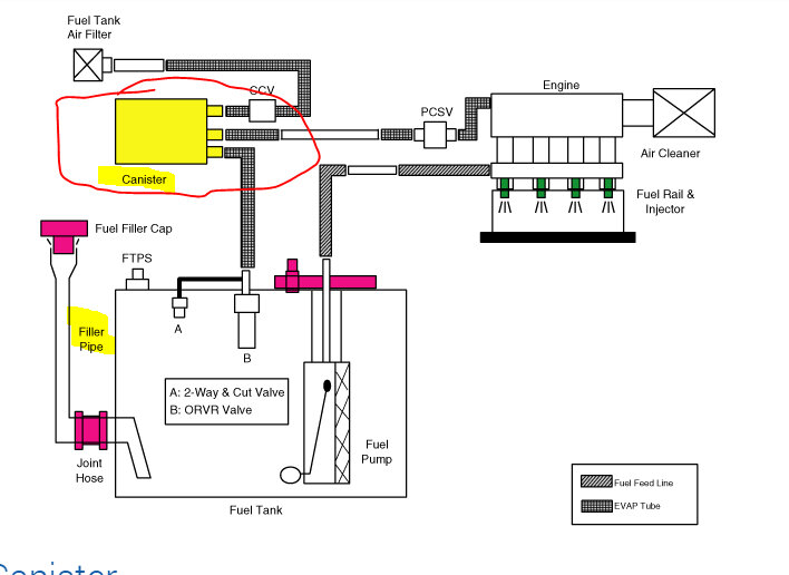 If that is in good condition, inspect the filler tube for any rust issues and the charcoal canister located under the vehicle in front of the fuel tank. Check the hoses to it making sure they are connected and not damaged. (See pic 1)