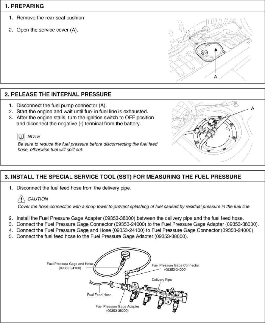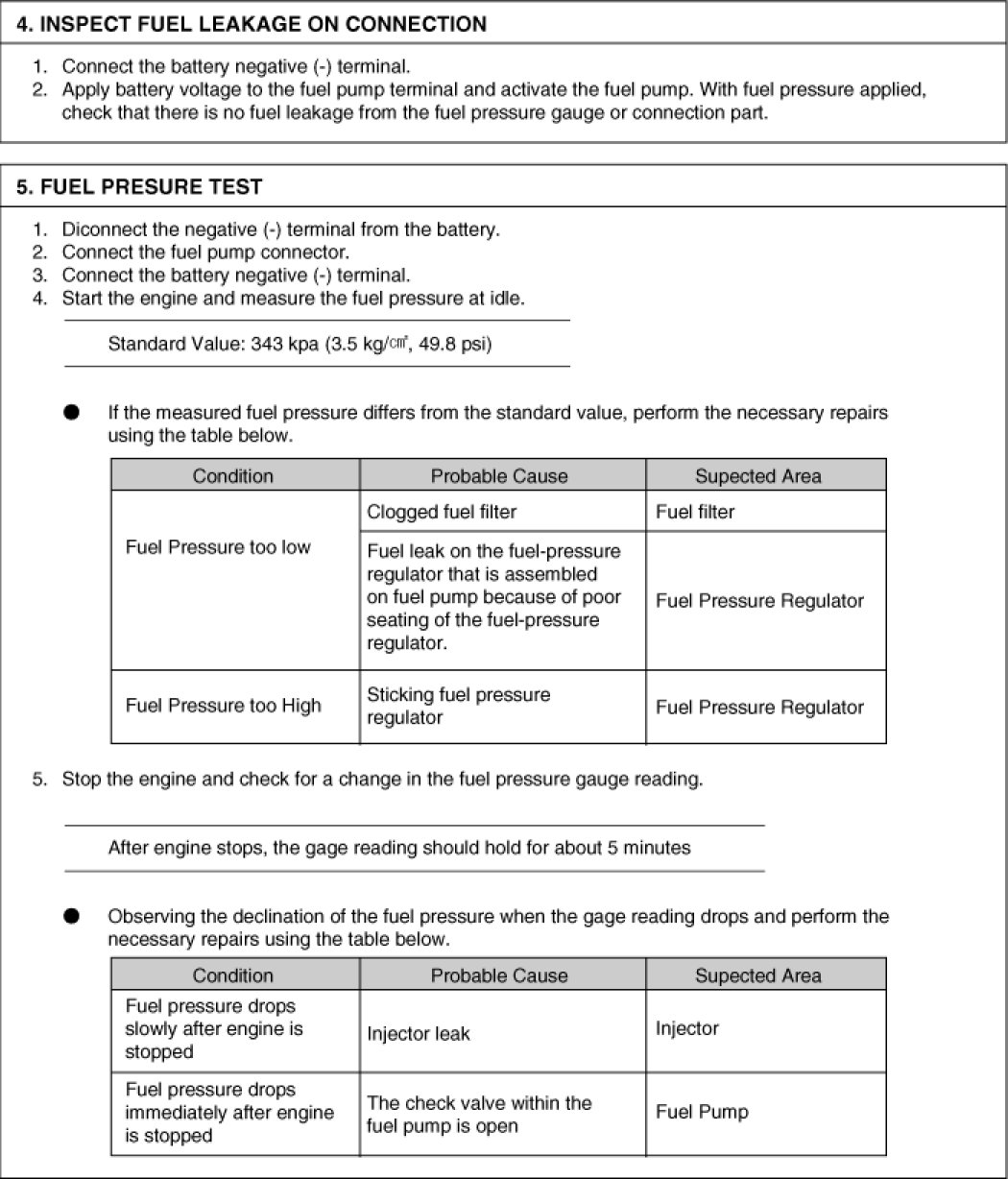 Next, I have attached three pictures which are the directions specific to checking fuel pressure on your vehicle. Keep in mind, this could be something as simple as a partially plugged fuel filter. Here are the manufacturer's specs for pressure.