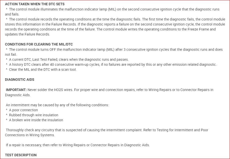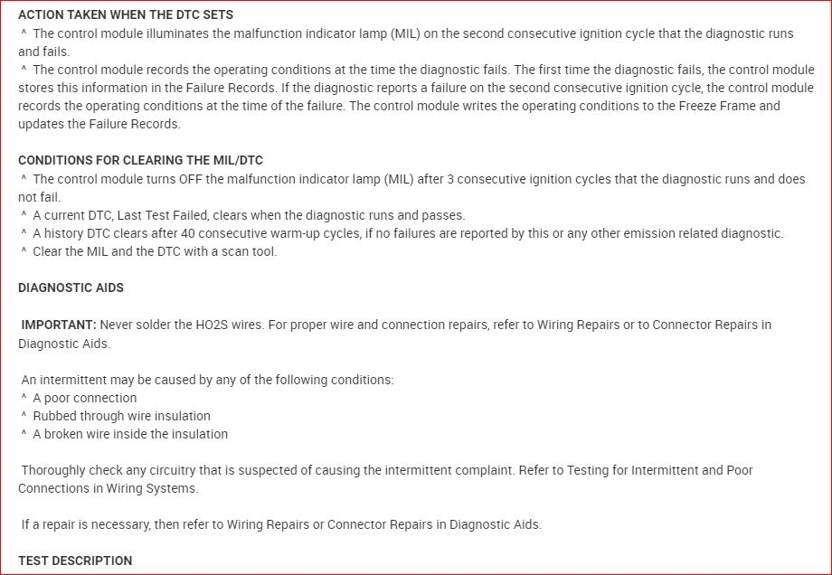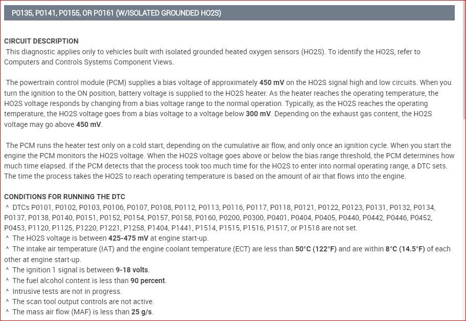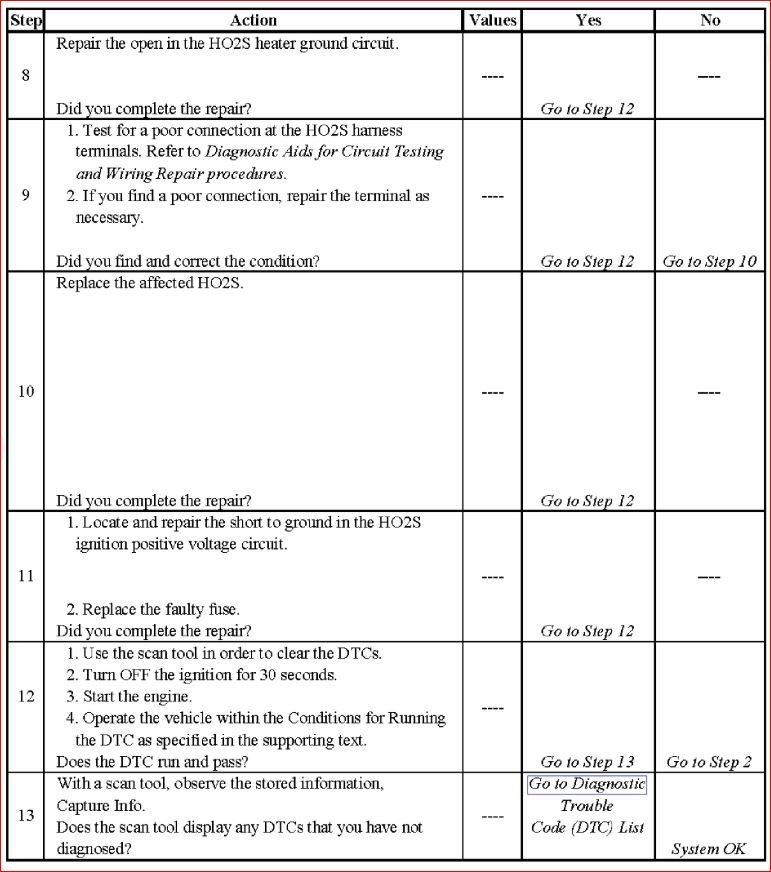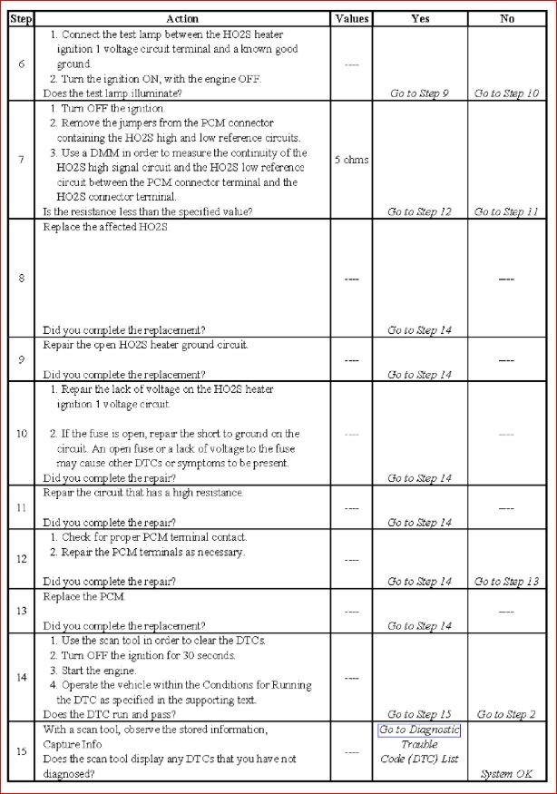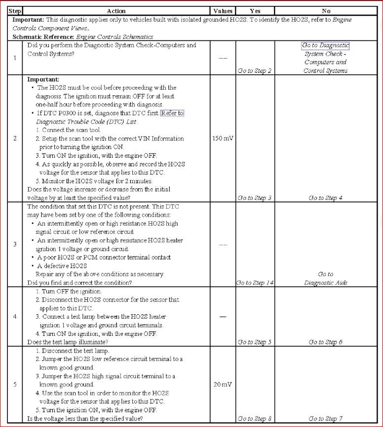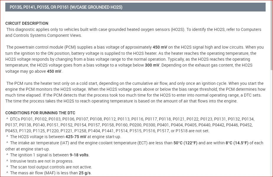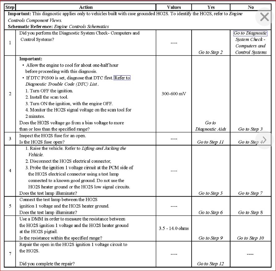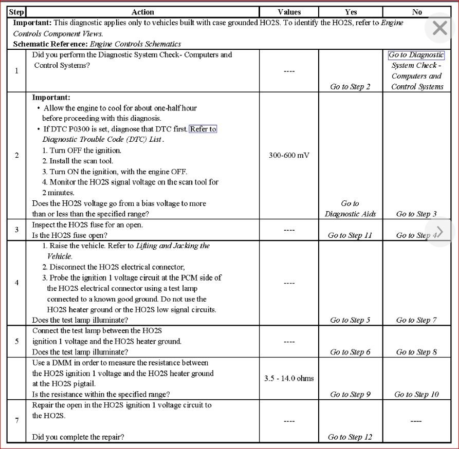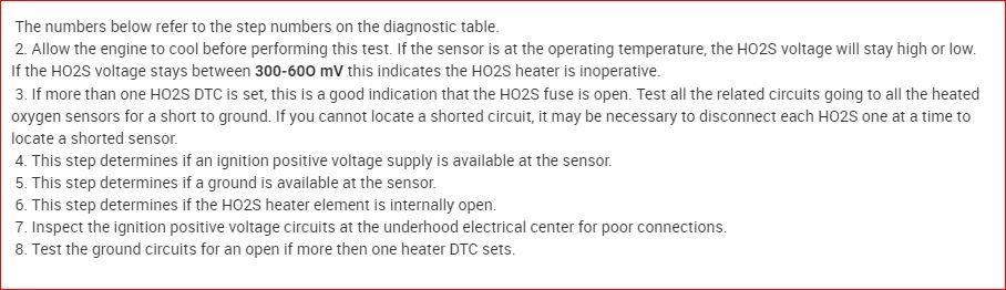 I attached the tests for this to determine what the root cause is. The difference between these tests are if you have an isolated ground for the o2 or they are case grounded. Meaning to you have a ground wire coming from the sensor or not. Obviously you will need to follow the test for whichever you have.