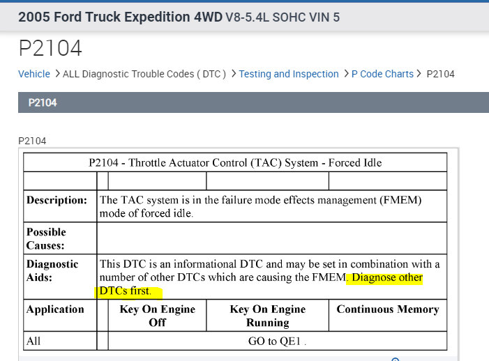 Code P2104 is an informational code indicating a forced idle. When this code shows up, the manual indicates to diagnose other codes before focusing on it. See pic 1 below.
