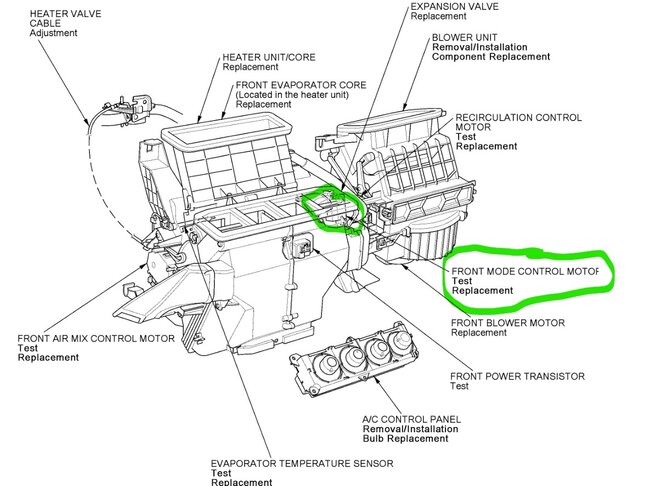 Sounds like the mode control linkage has an issue. Honda uses a mode controller that moves the air doors to control airflow using a few linkage arms that move depending on where you want the air to go. If you can select defrost or floor and those work but not the dash then it is the linkage, if you select them and it doesn't change from defrost to floor then it is most likely the actuator. Both items are not that hard to access. To get to them you need to remove the glove box, for that you release the two taps in the lid then remove the two bolts from underneath the hinge and set the box out of the way. The linkage and actuator will be visible inside the door opening to the left side. To test it simply turn the key on and select the various airflows, so defrost, dash, floor. Watch the movement of the arms behind the actuator (circled in orange). As the airflow changes, those should move. I've seen the screw that secures the front lever come out and the arm doesn't pivot the way it should.
