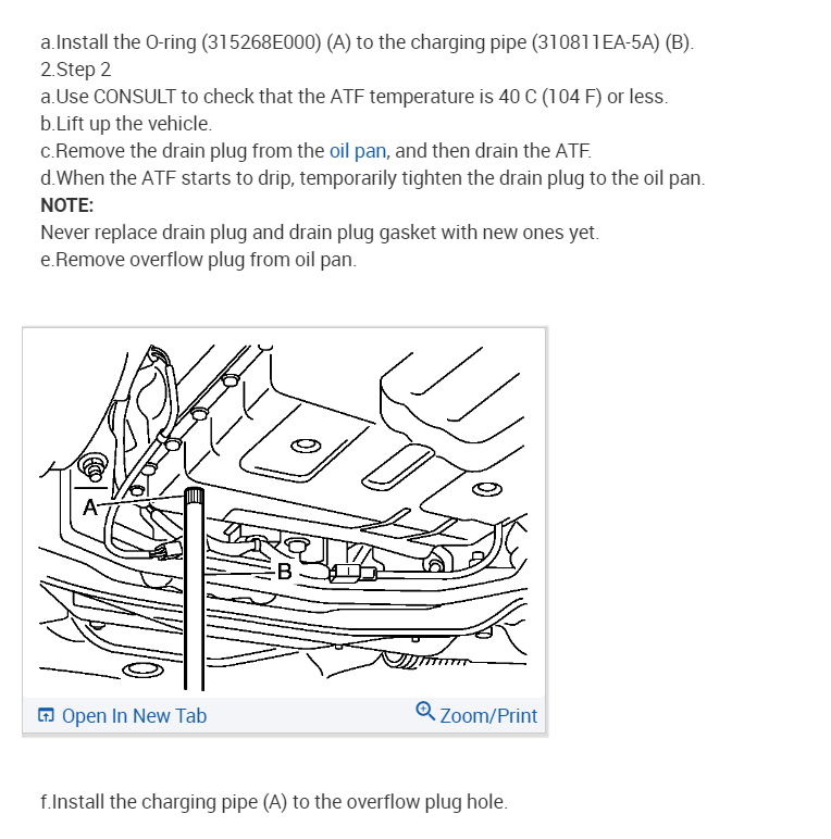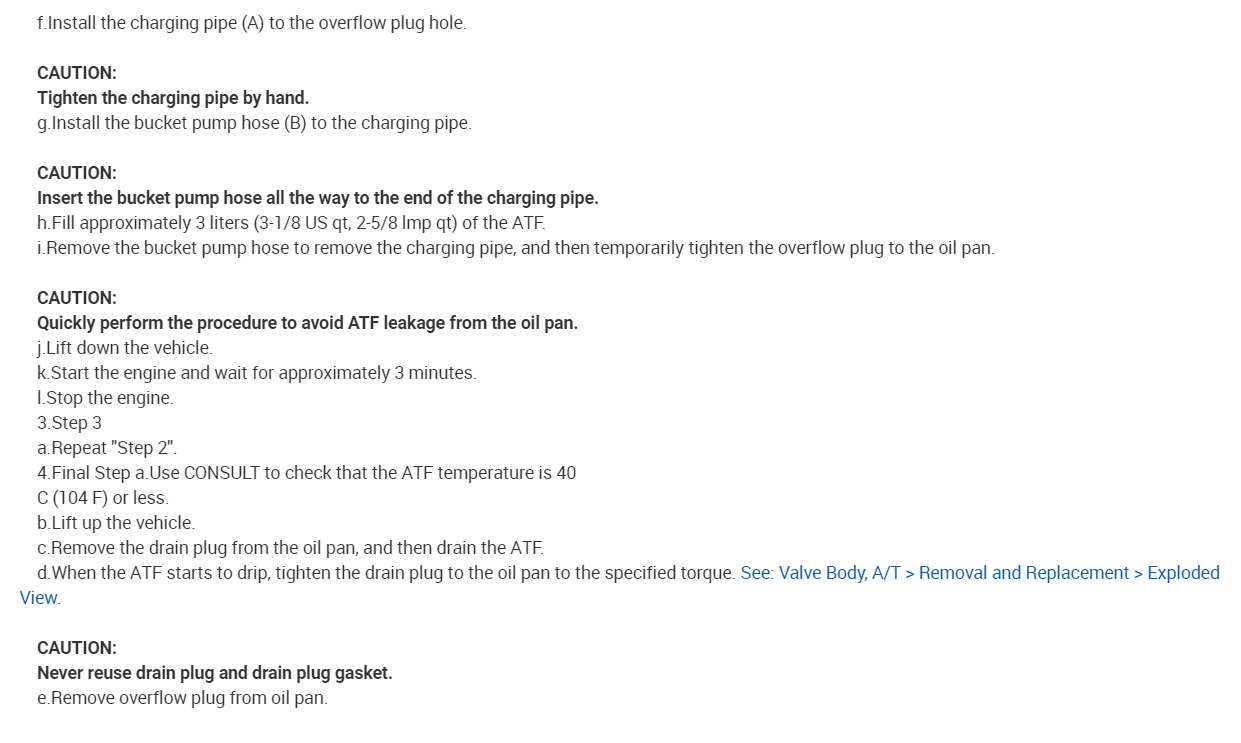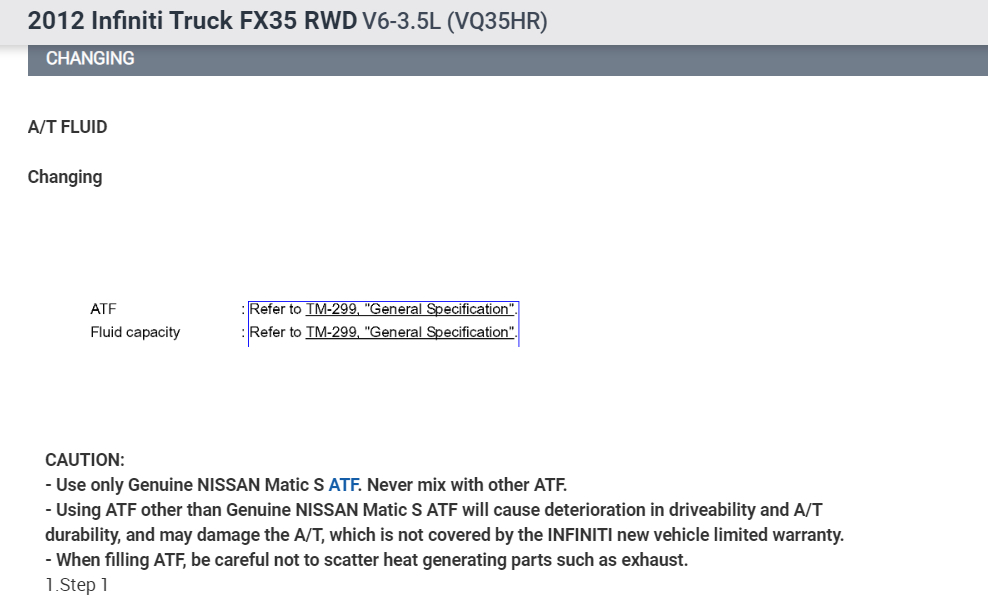 Using automatic transmission fluid other than Genuine NISSAN Matic S ATF will cause deterioration in drivability and automatic transmission durability, and may damage the automatic transmission, which is not covered by the Infinity new vehicle limited warranty.