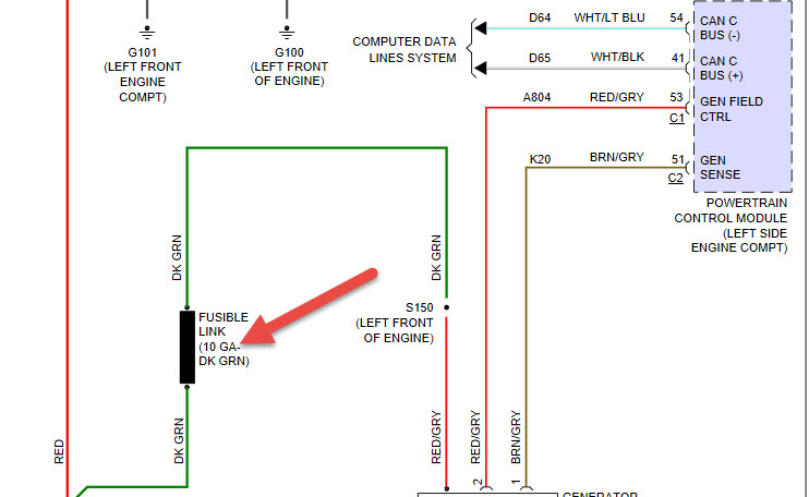 If you will look back at the diagram that my partner, HMAC300 provided you can figure out that the RED/ GRAY that turns into green has Mr. Fusible Link in it.