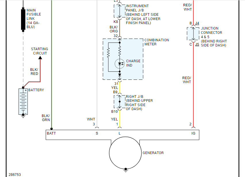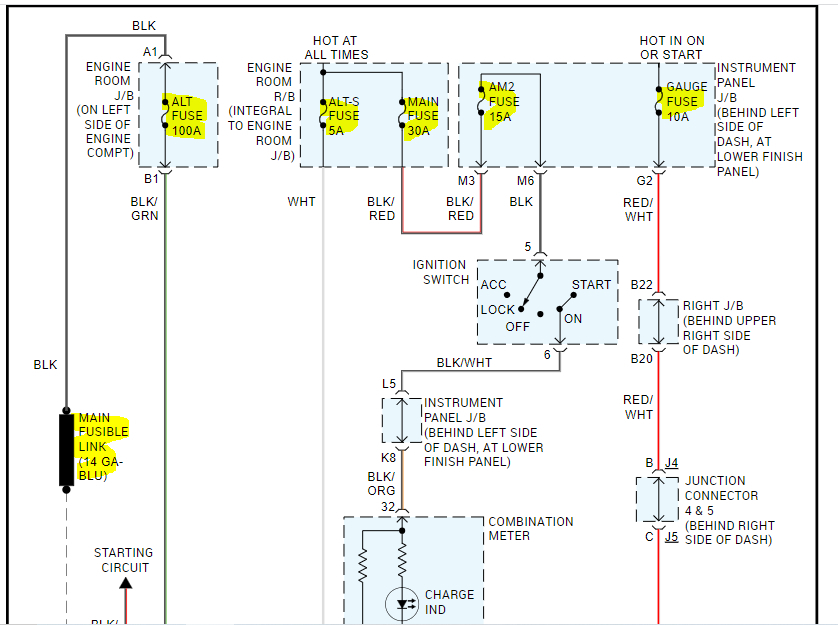 Next, I attached two pictures below of the charging system wiring schematic. Note that I had to cut the pic in half to make it readable. I did overlap the two and highlighted fuses I need you to check.
