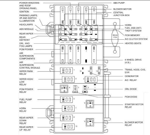 The wiring harness in the engine compartment, the end which goes to the right side by the air cleaner and where the blower was, the only connections I think I would need would be for the right front brake (anti-lock system?) And the cruise control unit (which I will be removing and will not need) - do you have a layout of the relays in the relay box which mounts to the air cleaner support mount, and do you have a diagram schematic for showing what goes to what for the engine compartment wiring harness?