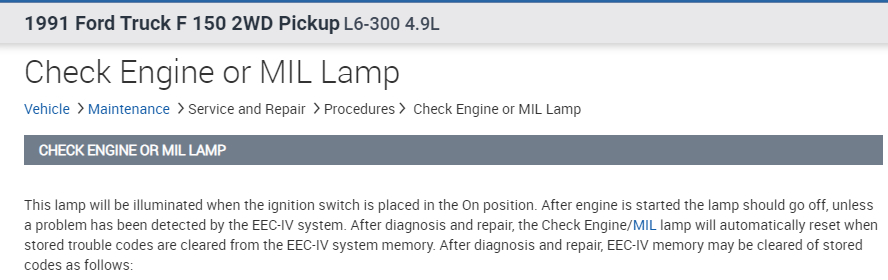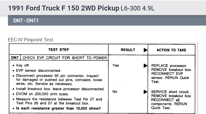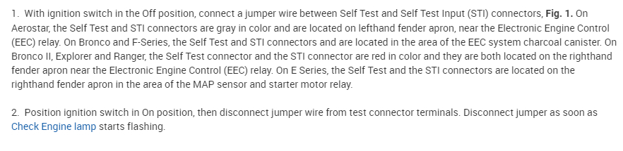 Sure enough, at roughly 120,000 miles the light came on, my code reader gave an EGR code. I called the retired Dealer mechanic who had fixed it the first time. He said to clear the code with the reader and see if it came on again. If so, he suggested that the easiest next step, rather than go through the diagnostic process, was to replace the EGR valve assembly, making sure the associated plumbing was clear. I did. Cancelled the code again, it returned after about 10 miles. He then told me to go through the process I cad used on my 1989 Bronco II which involved key-on, push and hold a button on the Controller/computer unit, turn off/turn on. It worked on the Bronc-ette. No button on this EEC. Various sources have said that the button is, variously, located 'near the fuse panel' 'under the steering column' and, my favorite, 'behind the glove box. No dice. What now? By the way, the truck runs great, averaging 18-20 MPG.