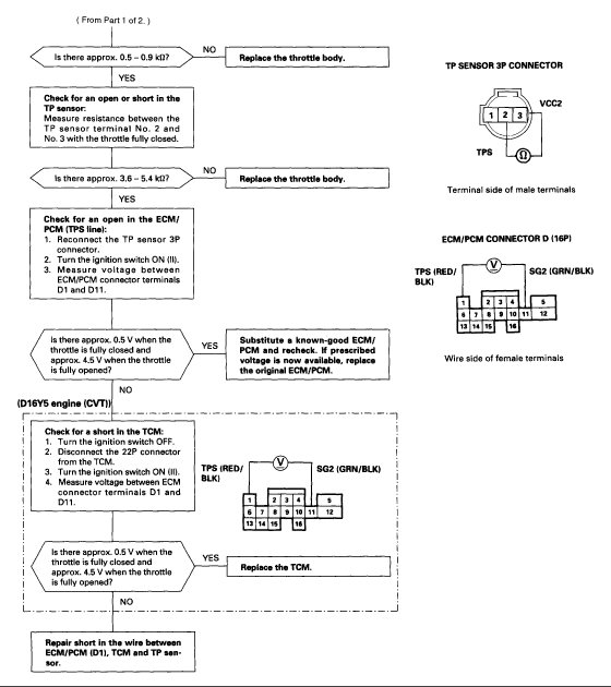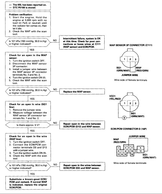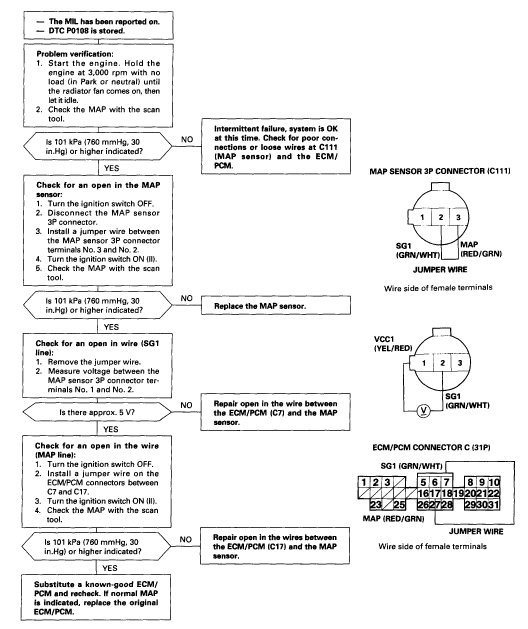 Hi and thanks for using 2CarPros.com. The P0108 code deals with the manifold absolute pressure sensor, MAP. It indicates a high voltage (low vacuum) problem. Interestingly, that code refers to a vehicle that has a manual transmission, not an automatic that you indicated. Additionally, there are two different engines. One is a VTEC and the other is not. I have attached two flow charts for your review. The first one is for the VTEC and the second one is the non-VTEC. The second code, P0122, indicates a low voltage in the throttle position sensor, TPS. Pictures 3 and 4 are flow charts related to this problem.