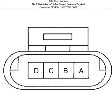 IDLE AIR CONTROL SYSTEM DIAGNOSIS 1. Perform On-Board Diagnostic (OBD) system check. See ON-BOARD DIAGNOSTIC (OBD) SYSTEM CHECK in appropriate SELF-DIAGNOSTICS article. Go to next step. 2. Set parking brake and block wheels. Turn A/C off. Start engine and let idle. Install scan tool and select SPECIAL FUNCTIONS. Select IAC SYSTEM TEST, and then RPM CONTROL. Using scan tool, command engine speed to 500 RPM. If actual engine RPM is within 100 RPM of scan tool display, go to next step. If actual engine RPM is not within 100 RPM of scan tool display, go to step 4. 3. Using scan tool, command engine speed to 1200 RPM. If actual engine RPM is within 100 RPM of scan tool display, check for a non-IAC system problem (i.e., vacuum leak, sticking throttle cable, fuel system lean or rich, throttle body, poor electrical connections, faulty PCV valve, A/C compressor circuits). If actual engine RPM is not within 100 RPM of scan tool display, go to step 5. 4. Check for vacuum leaks, sticking throttle plates, faulty PCV valve, or restriction in air induction system. If problem exists, go to step 20. If problem does not exist, go to step 6. 5. Check for obstruction or excessive carbon deposit in throttle body IAC passages. If problem exists, go to step 21. If problem does not exist, go to next step. 6. Turn ignition off. Disconnect IAC valve harness connector. Check for poor connection at IAC valve. If problem exists, go to step 19. If problem does not exist, go to next step. 7. Connect IAC Driver (J-37027-A) to IAC valve. Set parking brake and block wheels. Turn A/C off. Start engine and let idle. Install scan tool and monitor engine RPM. Using IAC driver, extend and retract IAC valve. If engine RPM decreases and increases as IAC valve is cycled, go to next step. If engine RPM does not decrease and increase as IAC valve is cycled, go to step 22. 8. If RPM changes smoothly with each flash of IAC valve cycle, go to next step. If RPM does not change smoothly with each flash of IAC valve cycle, go to step 22. 9. Install appropriate IAC node light onto IAC valve harness connector. Cycle IAC driver and observe lights. Both lights should cycle Green to Red, but never off as RPM changed over its range. If lights flash as specified, go to next step. If lights do not flash as specified, go to step 12. 10. Remove IAC driver from IAC valve. Using DVOM, measure resistance between IAC valve terminals "A" and "B". See Fig. 8 . Also, measure resistance between IAC valve terminals "C" and "D". If resistance is 40-80 ohms on both measurements, go to next step. If resistance is not 40-80 ohms on both measurements, go to step 22. 11. Using DVOM, measure resistance between IAC valve terminals "B" and "C". See Fig. 8 . Also, measure resistance between IAC valve terminals "A" and "D". If resistance is infinite on both measurements, check for a non-IAC system problem (i.e., vacuum leak, sticking throttle cable, fuel system lean or rich, throttle body, poor electrical connections, faulty PCV valve, A/C compressor circuits). If resistance is not infinite on both measurements, go to step 22. 12. Turn ignition off. Disconnect PCM harness connectors. Check for poor connections at PCM. If problem exists, go to step 19. If problem does not exist, go to next step. 13. Remove IAC node light. Check for an open in IAC driver circuits between IAC valve harness connector and PCM harness connector. If problem exists, go to step 19. If problem does not exist, go to next step. 14. Using a test light connected to battery voltage, probe IAC valve harness connector terminals. If test light illuminates at any terminal, go to step 17. If test light does not illuminate at any terminal, go to next step. 15. Turn ignition on with engine off. Using a test light connected to ground, probe IAC valve harness connector terminals. If test light illuminates at any terminal, go to step 18. If test light does not illuminate at any terminal, go to next step. 16. Check for a short between IAC valve circuits. If problem exists, go to step 19. If problem does not exist, go to step 23. 17. Repair short to ground in IAC circuit. After repairs, go to step 24. 18. Repair short to voltage in IAC circuit. After repairs, go to step 24. 19. Repair circuit as necessary. After repairs, go to step 24. 20. Repair condition as necessary. After repairs, go to step 24. 21. Clean IAC passages. After repairs, go to step 24. 22. Replace IAC valve. After repairs, go to step 24. 23. Replace PCM. Program PCM. Perform VTD password relearn procedure and crankshaft variation learn procedure. See COMPUTER RELEARN PROCEDURES article in GENERAL INFORMATION. After repairs, go to next step. 24. Install scan tool. Start engine and let idle. Turn off all accessories. Using scan tool, command engine speed to 1200 RPM, and then down to 500 RPM. Again, using scan tool, command engine speed as specified. If actual RPM is close to commanded RPM, system is okay. If actual RPM is not close to commanded RPM, go to step 2.