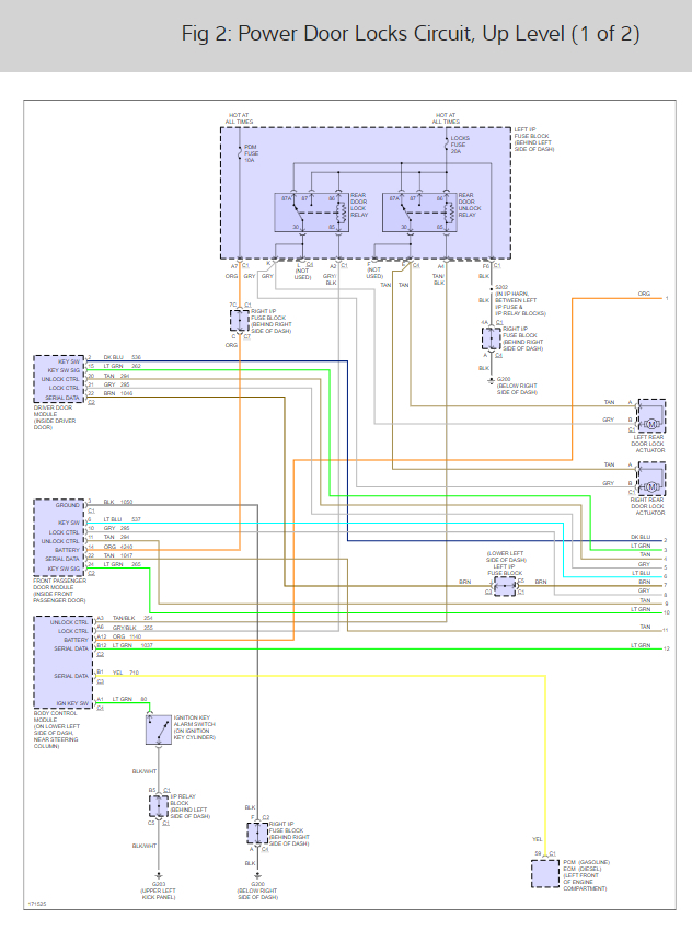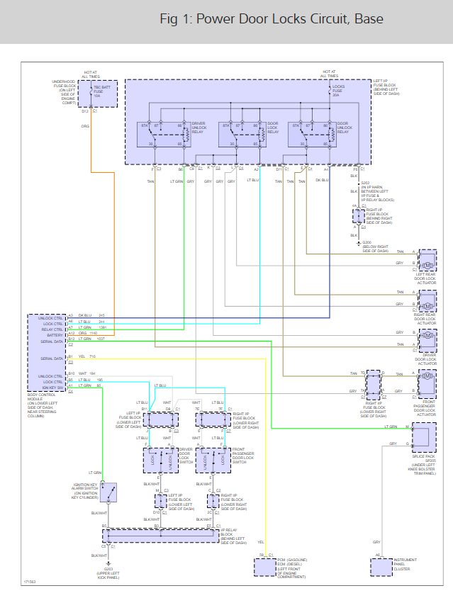 Here is the problem, when you lock the door all four doors will lock. When you unlock the doors only the front two will unlock. I thought maybe the relays so I found them and swapped them out they both had the same part number. The problem changed when you unlock the doors all four will unlock but when you lock them only the front two will lock and you can open the back two door and not set off the alarm system. I think I am chasing a wiring problem need a schematic to help trouble shoot or is there another relay that I don't know about.