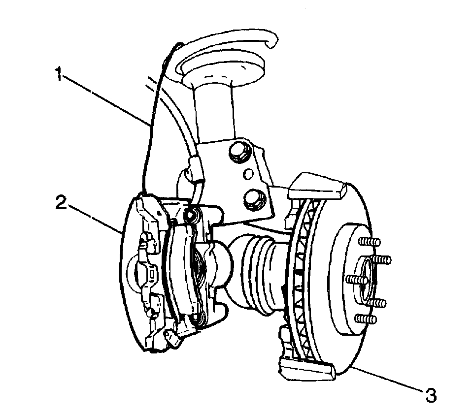 Notice: Support the brake caliper with heavy mechanic's wire, or equivalent, whenever it is separated from it's mount and the hydraulic flexible brake hose is still connected. Failure to support the caliper in this manner will cause the flexible brake hose to bear the weight of the caliper, which may cause damage to the brake hose and in turn may cause a brake fluid leak.