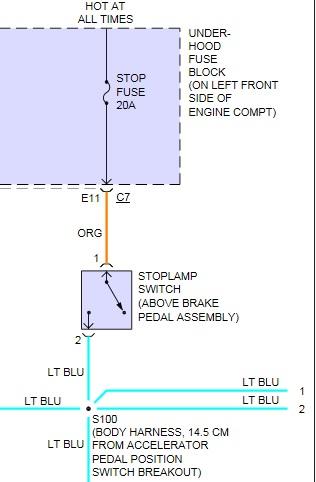 Just wanted to add the diagram. The orange wire carries voltage to brake switch. When brake switch is activated, the lite blue wire carries voltage for brake lamps. Did you check brake fuse?