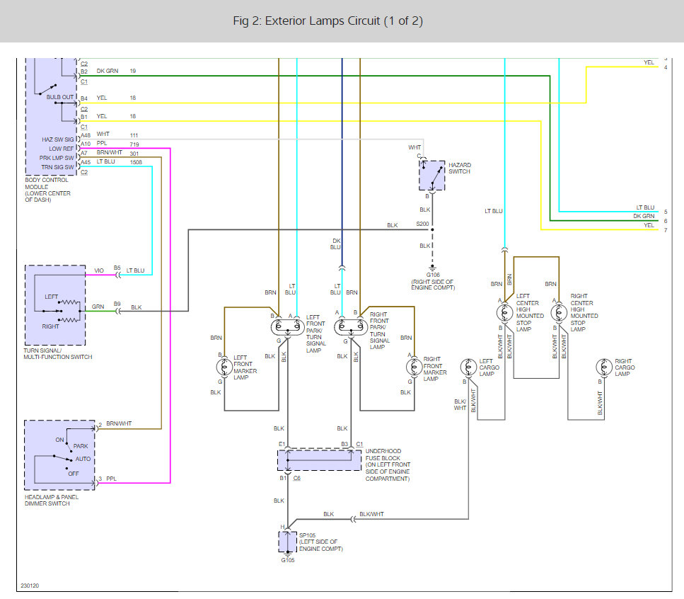 Left brake light and left front turn signal don't work as such, but the light bulbs work when used for parking lamp and rear turn signal. The left brake light doesn't turn on when the brake is pushed, but the top bulb works when the headlamps are on and the second bulb works for the turn signal. Right side brake light functions normally. The front left turn signal doesn't work but the bulb is on when in park. What can I do to fix this?