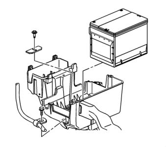 Install the battery to the battery box. CAUTION: Do not tip the battery over a 45 degree angle or acid could spill causing serious personal injury. NOTE : Refer to Fastener Notice in Service Precautions. Tighten the battery hold down bolt to 15 N.m (11 lb ft) .