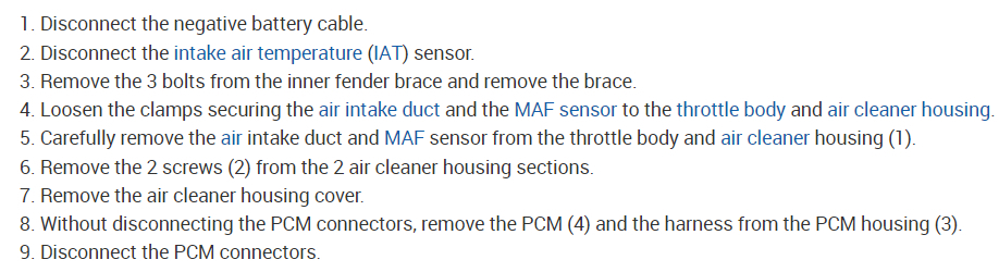 Its the same thing-disconnect the negative battery cable then find it and unplug the wiring connectors-Bear in mind that you might have to go thru a computer relearning process after replacement due to battery disconnection.