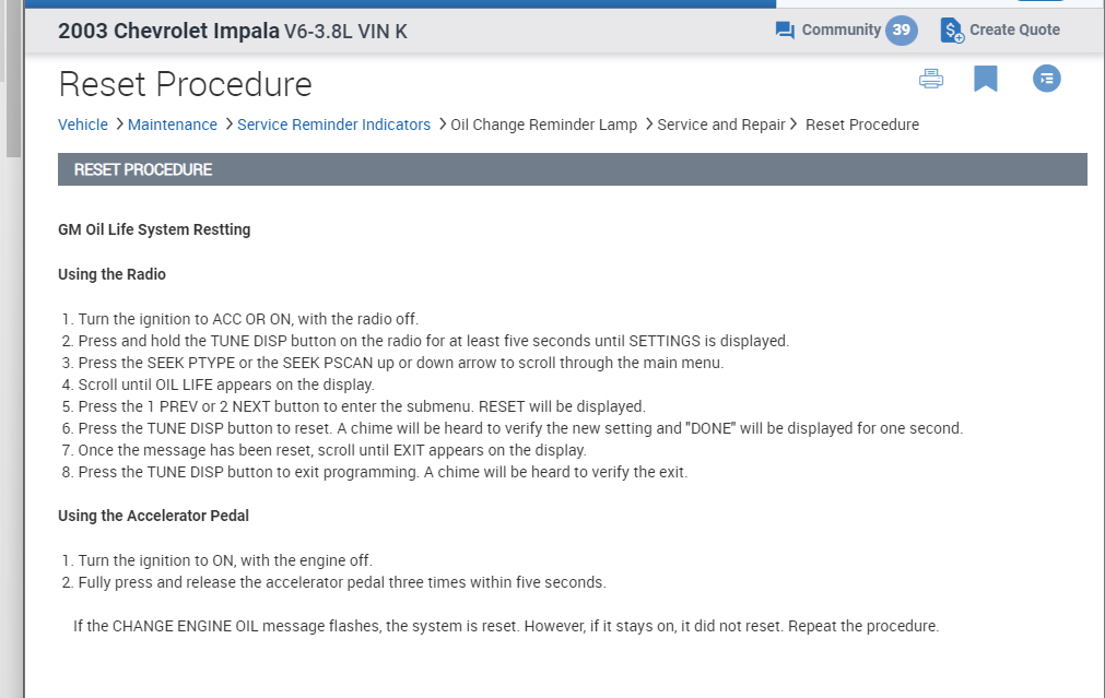 I just got my 03 impala. Its a 3.4l v-6 and I already did a tune up. Changed motor oil, oil filter, transmission fluid, air filter, plugs, wires, new battery and all of that but I cant figure out how to reset the "change engine oil" light on dash. If any one has the answer I would really appreciate the help because that light really buggs me. I hate seeing those lights on my dash.