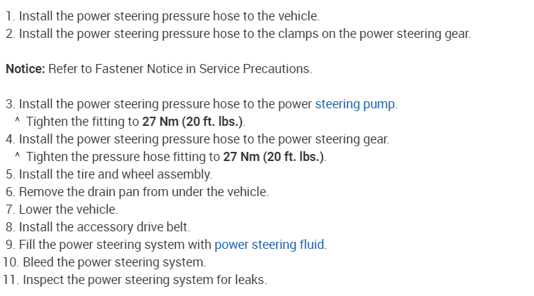 Tighten the power steering pressure line fitting to the power steering gear to 27 N Â m (20 lb ft).