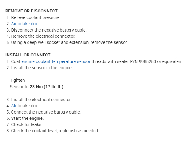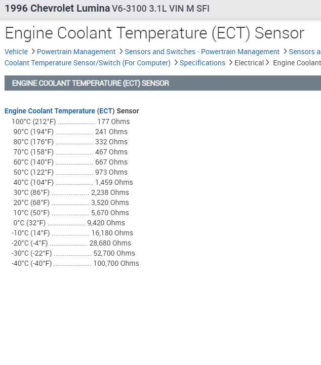 I have attached the temperature and resistance value list below. Check the resistance between the pins on the sensor. If it does not fall within the specification, it needs to be replaced.