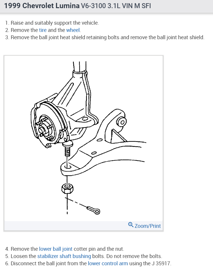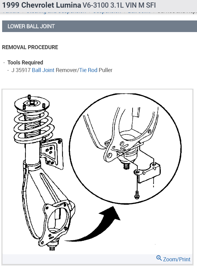 Welcome to the forum, I tried to post the information, did not work. Autozone. Com has free information. You will have to register your vehicle, it is free. Then in the parts search box, upper right, type in ball joint, the next page that comes up in the right column is link for removal of ball joint.