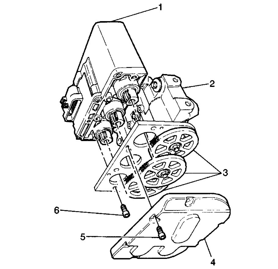 4. Remove the four Torx head screws (6) attaching the motor pack (1) to the brake modulator (2).