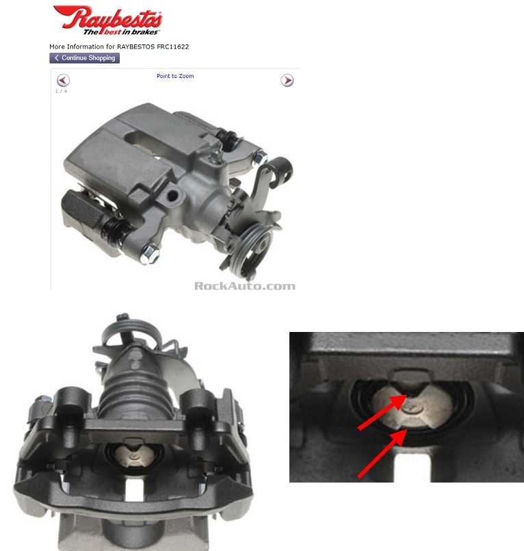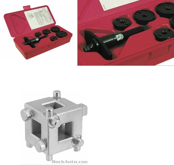 The second photo shows two different piston resetting tools. The bottom one just rotates the piston. The set in the red case also pushes it back as it rotates it. The two red arrows in the first photo are pointing to two notches in the piston. Mating pins on the resetting tool grab those notches to turn the piston.