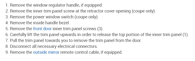 How do I remove the interior door panel on a 1999 monte carlo? I have removed the 6 screws around the panel, the one inside the latch and removed the mirror control on top but it still feels like it is connected to something in the center of the door.