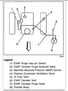 I have attached the pic again for the vehicle listed above. If you follow that, start with #2 the EVAP canister purge solenoid valve. A hose comes out of that and goes into one side of #1, the EVAP purge vacuum switch. From the other side of that switch, a long hose goes to the driver's side, most outside connection to #6, the EVAP canister Vent. From the inside of that vent, that hose goes to your fuel tank.