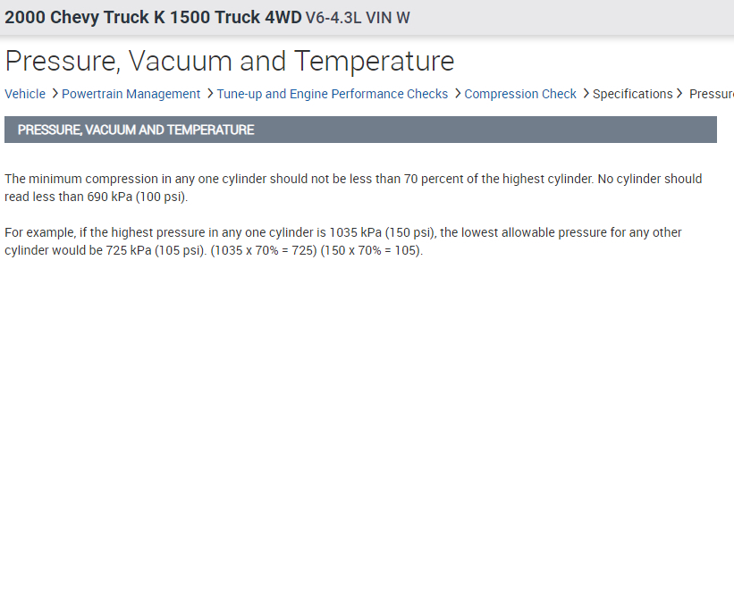The minimum compression in any one cylinder should not be less than 70 percent of the highest cylinder. No cylinder should read less than 690 kPa (100 PSI).