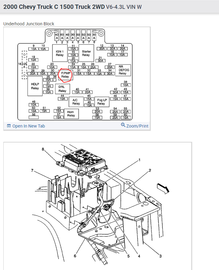 First check the fuel pump relay. The relay is located in the junction box under the hood (see diagram below).