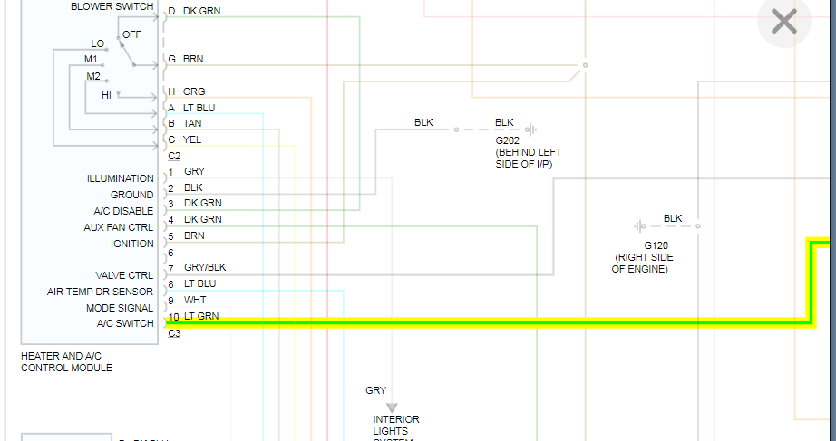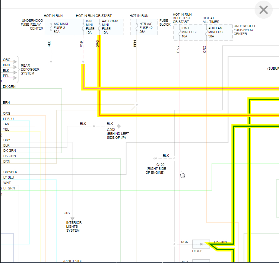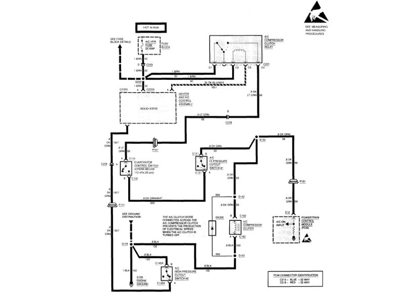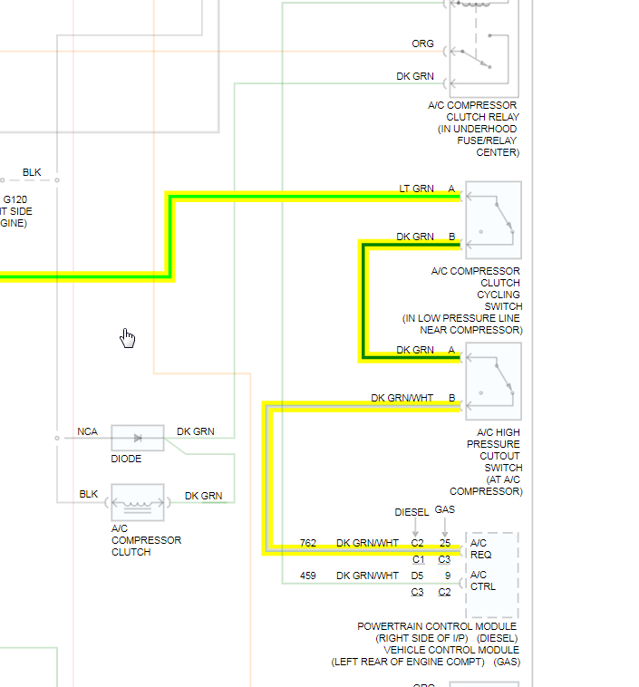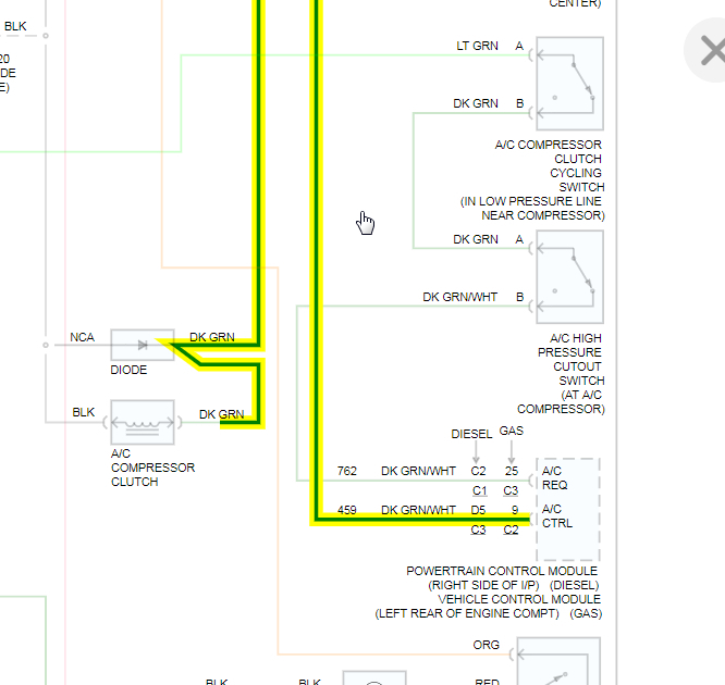 If that is the case, move onto the last two diagrams. These circuits are the command wires from the switch to the cycling switch, which leads to the pressure switch and that feeds to the PCM. Basically this is giving the info to the PCM in the following progression. You press the on button, which energizes the cycling switch, which energizes the pressure switch which sends power to the PCM. So this means if the power makes it all the way through to the PCM then the PCM says it is okay to turn on the compressor so it then sends power up to the clutch relay which sends it down through the clutch.