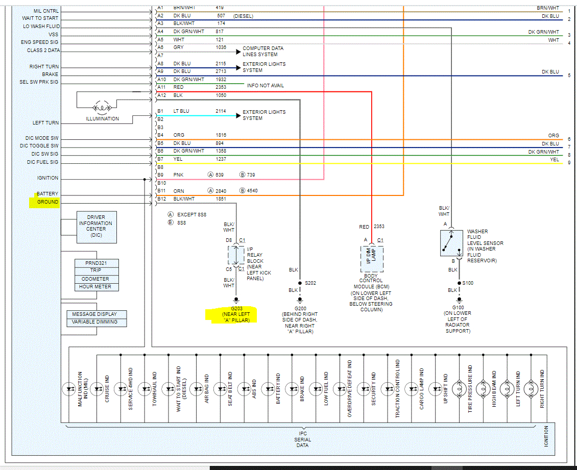 I attached two wiring schematic pics for the speedometer/IP. I highlighted the ground I would check just to make sure it is tight, not damaged, and not corroded. The ground is on the left side near the kick panel/A pillar. I had to cut the pic in half to make it readable, but I did overlap them so you can easily follow them.