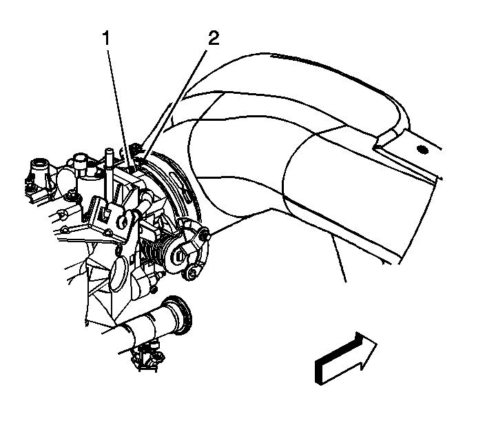 8. Align the arrow (2) at the throttle body end of the duct with the throttle body attaching stud (1).