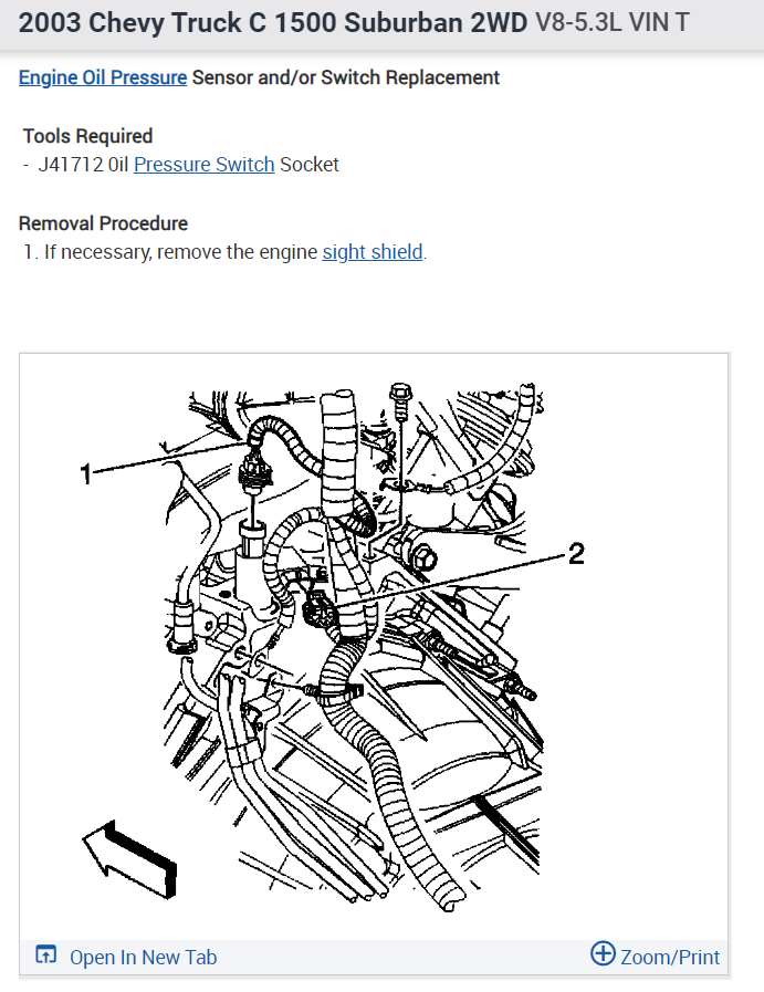 The oil pressure sensor is at the rear of the engine on the left side behind the intake manifold, here is the location and instructions on how to change it out. Check out the images (below). Let us know if you need anything else.