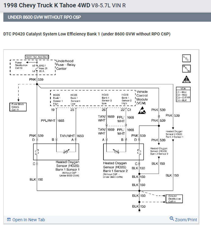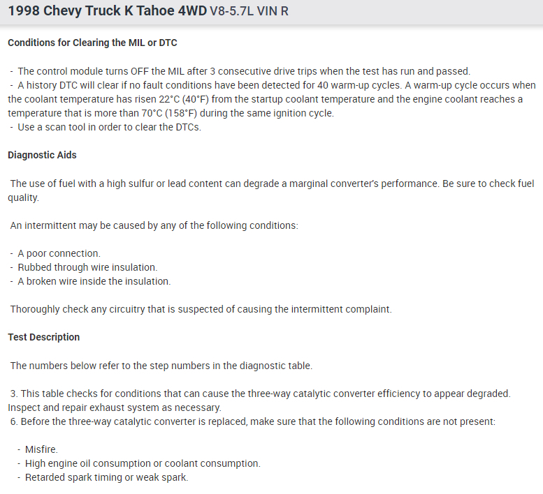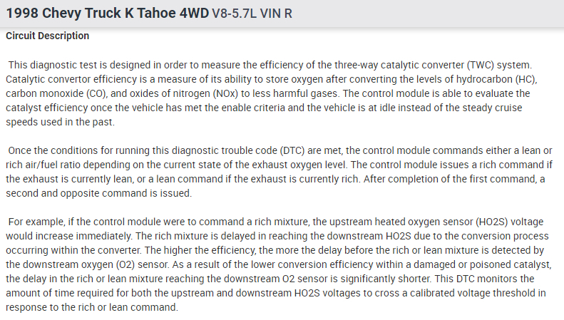 My 1998 Chevy Tahoe have the Check engine Light on. I used my Global OBD 2 code Scanner. The lecture said: Catalyst efficiency Low, Below threshold.
