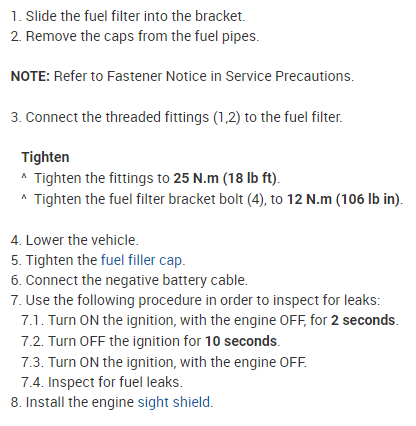 Position the fuel composition sensor/bracket into place and secure with the bracket nuts. Torque the nuts to 13 ft. Lbs. (17 Nm).