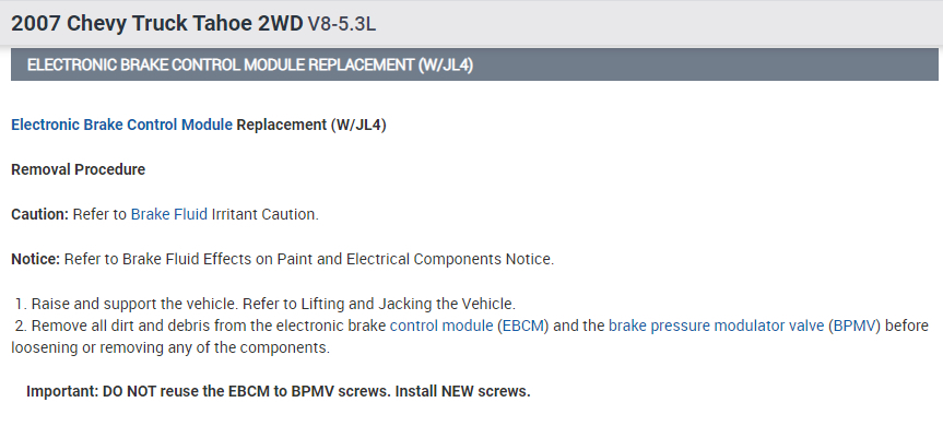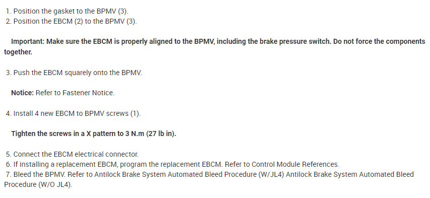 Here is the information you requested. After replacing the electronic brake control module you will need to perform 2 addition things. First is to perform a module relearn procedure after replacement and second is to perform an automatic ABS-anti-lock brake system bleed procedure. I've attached picture steps below on how to replace the module, perform the relearn process, and how to perform the automatic abs bleed procedure on your vehicle. This video will show you how
