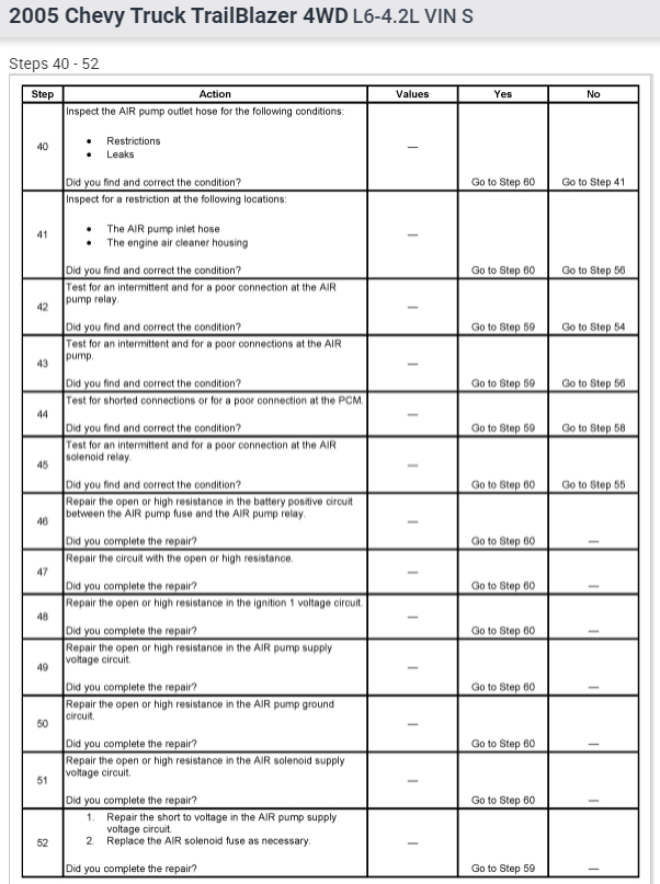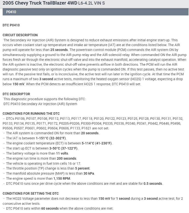 My trailblazer has check engine lite come on with code p0410 secondary air injection problem, my manual has no listing for this. I dont think I even have it but the lite keeps coming on for that problem. Having no other problems but this, bought vehicle new in 05