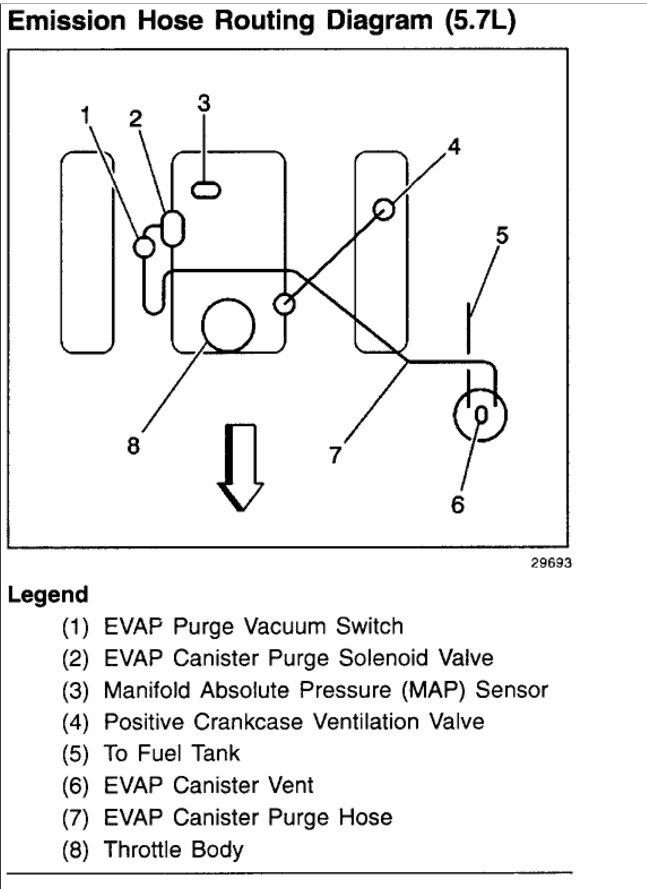The pcv hose on the driver side of the 5.7 liter engine connects from the valve cover to the intake manifold. There is another smaller vacuum line that comes from this connection at the intake manifold. Where does this vacuum line connect? On the passenger side of this same engine, there are 3 hoses/lines that connect to the evaporation emissions purge solenoid vacuum switch. One to the canister purge solenoid, one to the purge fitting at the vapor canister, but where does the third vacuum line coming off this device connect to? No vacuum diagrams show these 2 lines.