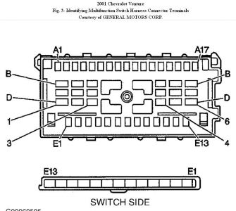 6.Measure resistance between multifunction switch pigtail harness connector C201 terminals E3 (Dark Green wire) and E9 (Yellow wire) - (component side). See Fig. 3 . Turn wiper portion of multifunction switch to MIST, LO and HI positions. If resistance is less than 2 ohms, go to next step. If resistance is 2 ohms or more, go to step 10 .